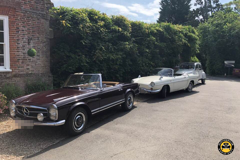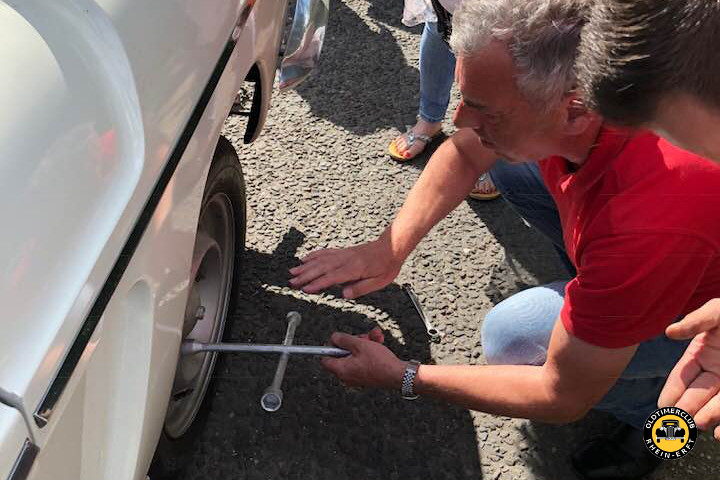 Irgendwann auf der Fahrt bemerkten wir, dass uns das letzte Auto nicht mehr folgte und erhielten prompt einen Anruf: „Wir stehen mit einem Plattfuß auf dem Parkplatz mit dem Obstverkaufsstand.“ Also am nächsten Kreisverkehr wenden … Elisabeth, die Fahrerin, diskutierte gerade mit dem Obstverkäufer. „Er sagt, in England darf man auf dem Parkplatz keinen Reifen wechseln, ruft uns aber gern einen Abschleppwagen.“ Nach kurzer Betrachtung der Sachlage legten wir Männer Hand an die Floride (Renault Sportcabrio) und hatten in gut fünf Minuten alles bereinigt. Der Abschleppwagen hätte länger gebraucht.