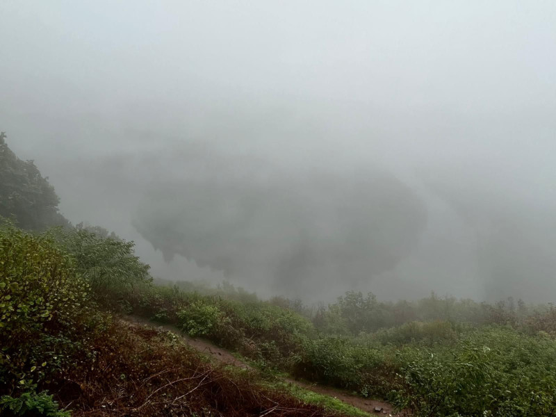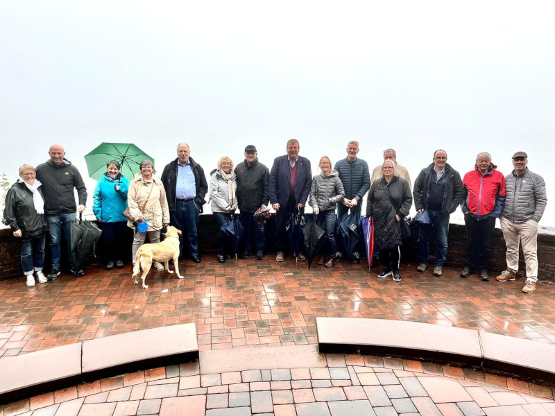 Nach dem guten Frühstück am 2. Oktober führte uns planmäßig der Weg zu Fuß vom Hotel zum Aussichtspunkt an der Saarschleife. Der aufgespannte Regenschirm war dabei unser Wegbegleiter. Am Aussichtspunkt angekommen, stellten wir fest, dass etwas fehlte, nämlich die Aussicht. Es war so neblig, dass man den Fluss nur ansatzweise erahnen konnte. Schade, aber lustig!