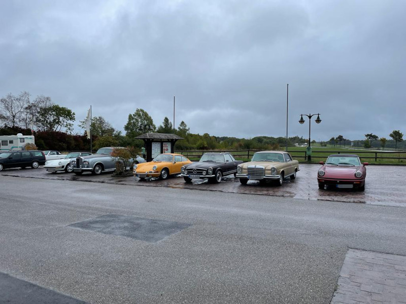 Am 1. Oktober trafen sich die 20 Teilnehmer um 10 Uhr in der Forstwalder Stube vor Blankenheim zum gemeinsamen Frühstück. Eine Stunde später ging die Ausfahrt los. über malerische kleine Straßen führte uns der Weg bei ergiebigem Regen durch die Eifel. In einer Regenpause hielten wir an einem Feldweg an, um einer Mitfahrerin, die an diesem Tag ihren Geburtstag feierte, die Gelegenheit zu geben, aus dem Kofferraum Sektgläser inklusive dem zugehörigen Prickelwasser zu zaubern und der Gruppe einen auszugeben. Der Weg führte uns weiter über stille Dörfchen nach Holsthum, wo uns im Landgasthof Oberbillig ein schmackhafter Imbiss neue Kräfte verlieh.